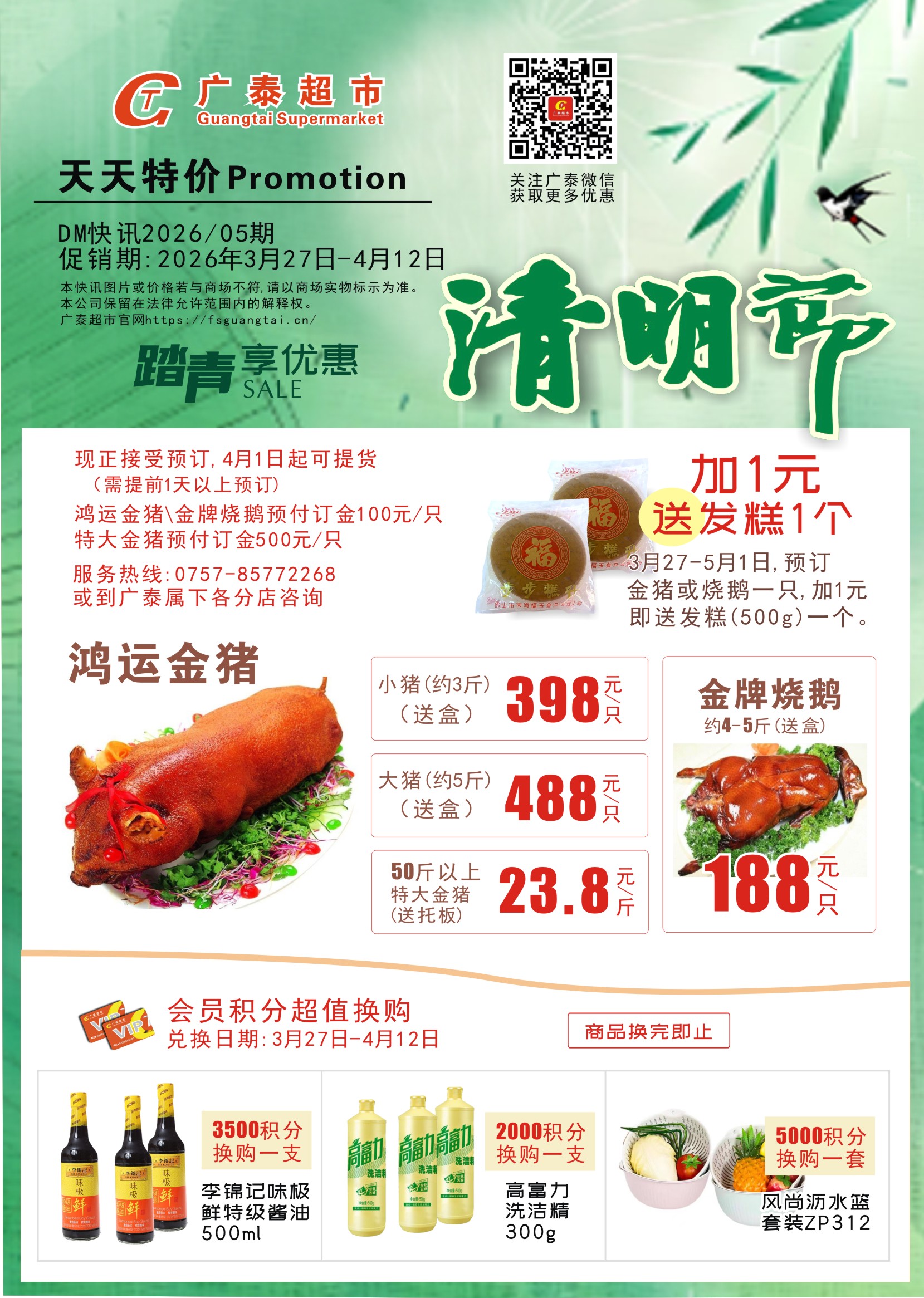 广泰超市|清明祭祖必备,鸿运烧猪 金牌烧鹅火热预订中!3月27日-5月1日预订加一元送发糕一个!